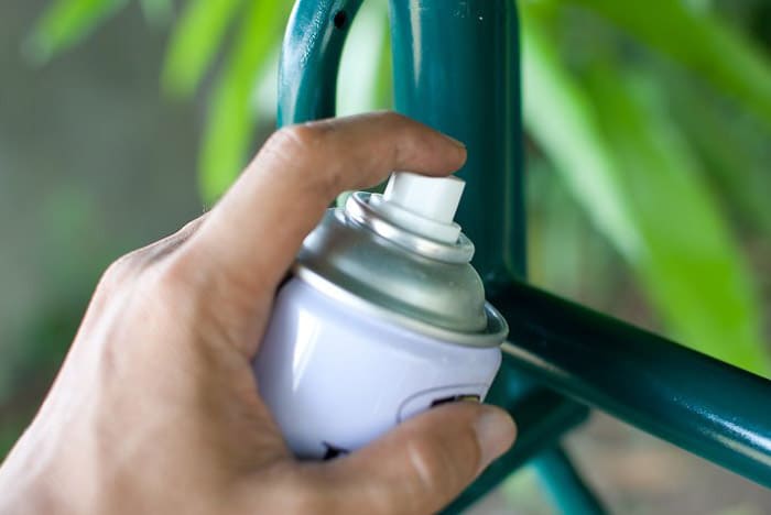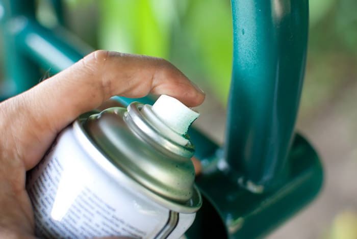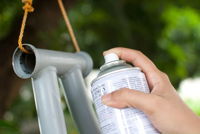 Приступаем к процессу покраски. Распылите первый слой краски по велосипедной раме. Держите баллончик (краскопульт) с краской на расстоянии 30 см от рамы, и равномерно распыляйте краску по всей поверхности рамы, избегайте скопления краски в одной области. Старайтесь, чтобы краска равномерно ложилась по раме. Делайте это до тех пор, пока вся поверхность не будет покрыта краской.